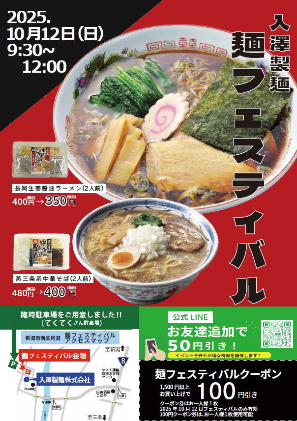 🎊10月の麺フェスティバル情報🎊 2025.10.12(日) 9:30~12:00 弊社敷地内特設会場にて 麺フェスティバル(工場直売会)を 行います。 たくさんのご来場お待ちしております☺️ #入澤製麺 #麺フェスティバル pic.x.com/vBgw839PfI