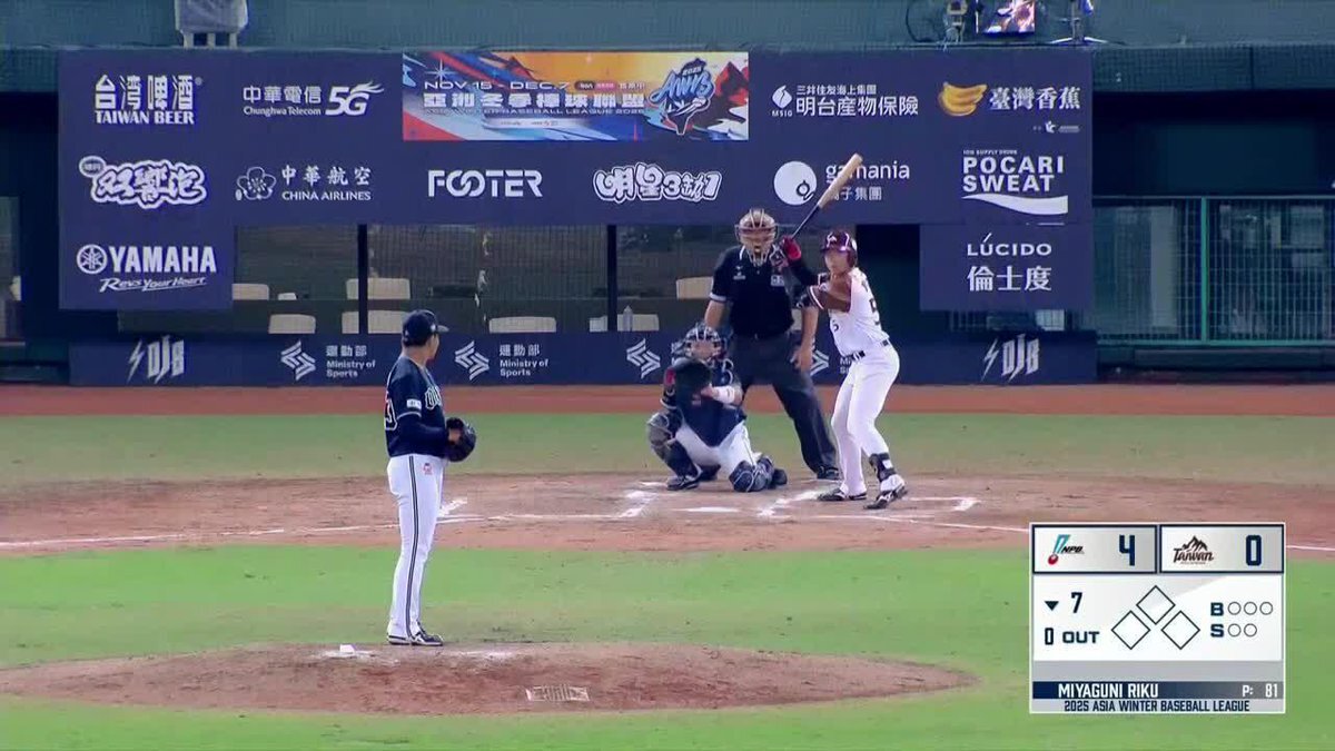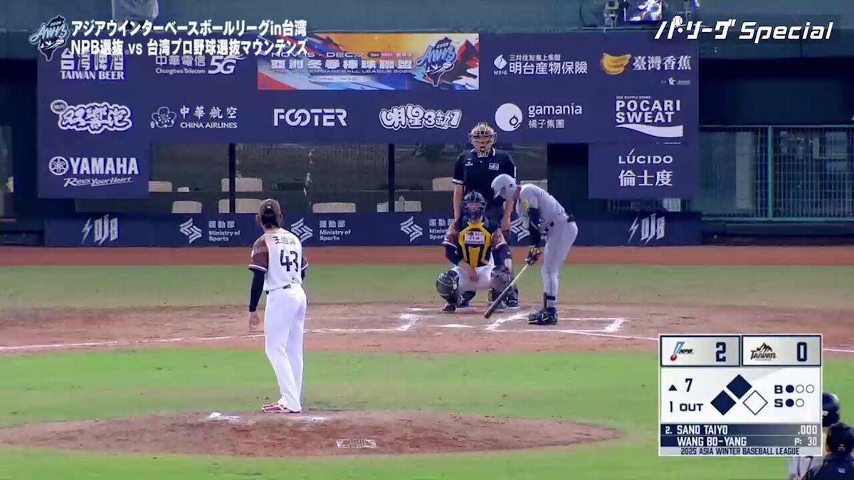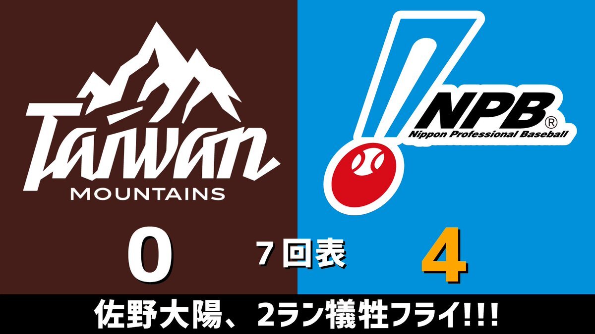 アジアウインターリーグ 台湾マウンテンズvs.NPB選抜 2025.11.25 7回表 佐野大陽、2ラン犠牲フライ!!! NPB選抜、4点リードです。 【NPB選抜全打席結果はこちらから】 ⇒ dnomotoke.com/archives/20251…