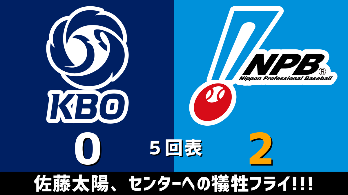 得点経過 NPB 2回相澤(巨人)タイムリー① 5回佐野(阪神)犠牲フライ① 6回吉野(楽天)タイムリー2B① 8回相澤(巨人)タイムリー① KBO 5回パク・チャンヒョクタイムリー① 6回パク・ゴンウタイムリー①