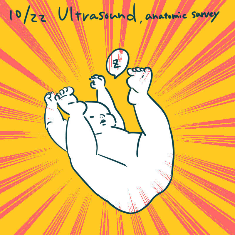 3回目の超音波行って来た!バナナとチョコ食べて行ったのにまた新生命体はねぼすけ💤途中で廊下歩いて来て〜って飴ちゃん渡されてようやく性別判明🥳背骨や内臓もしっかり形成されてきててすげ〜となりつつ、体勢あまりにもおかしくて思わず描いたわ😂犬神家かよ😂 pic.x.com/FNpFSUraB7