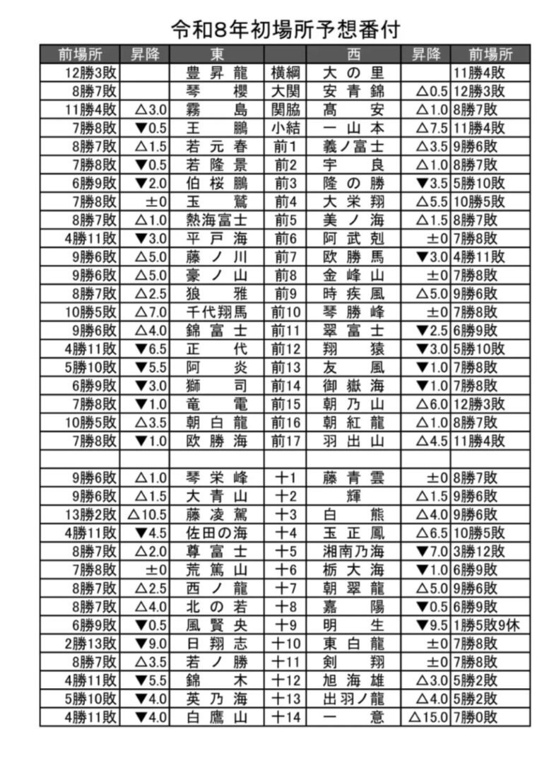 予想番付出ましたな。新三役に一山本、最入幕予想に朝乃山。一意が新十両。 さて!? 【令和8年初場所予想番付】 | BBMスポーツ | ベースボール・マガジン社 share.google/QN3Vsryihdrigk…