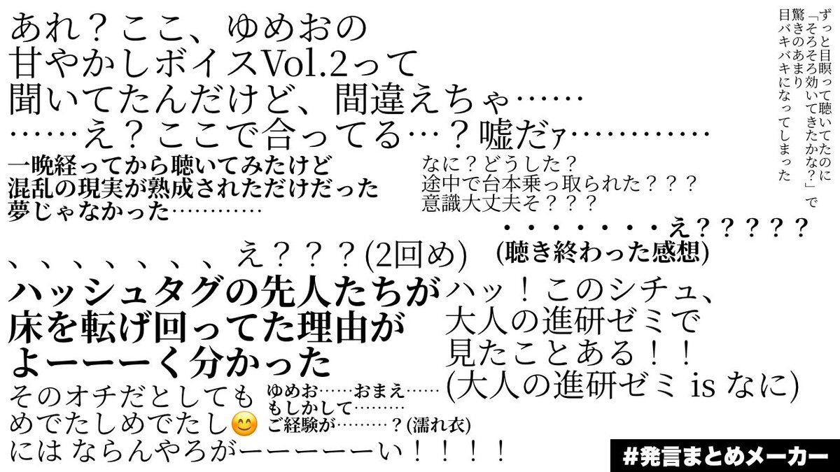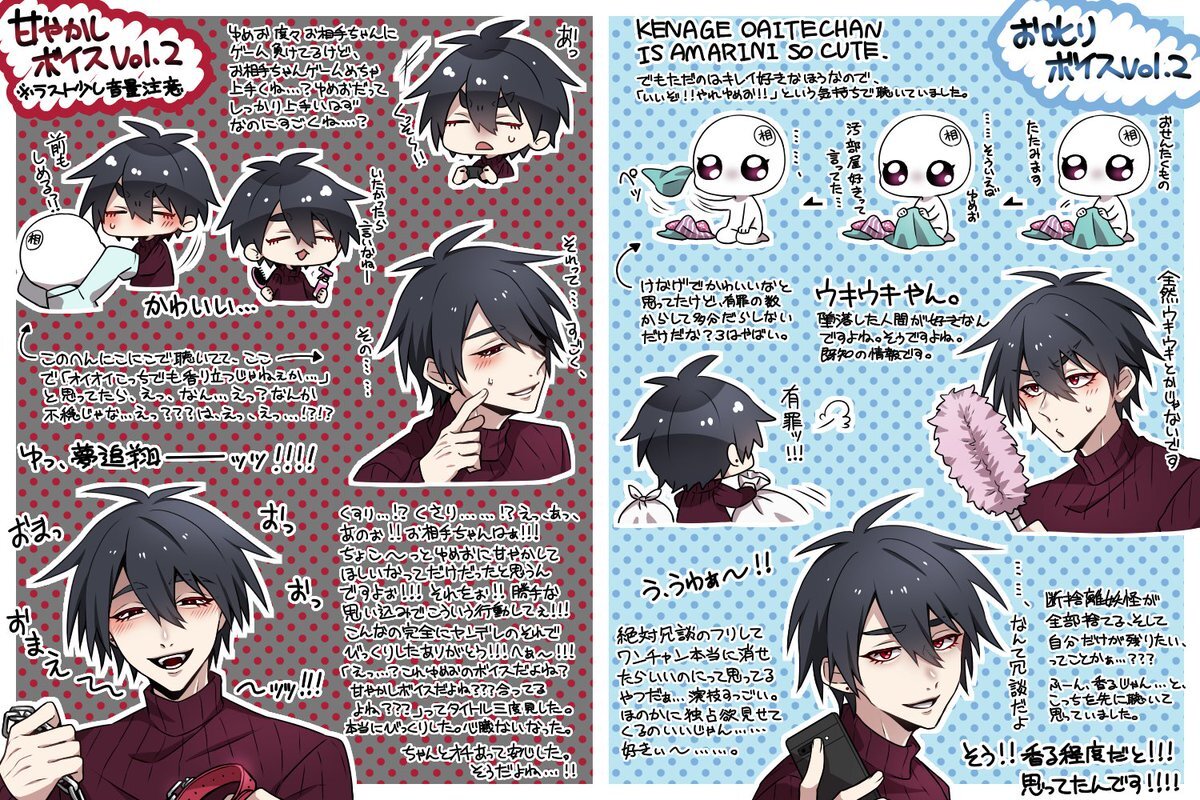 甘やかし&お叱りボイス! お叱りは、お相手ちゃんの片づけをゆめおが手伝う断捨離ボイス。ちょっと独占欲見えてヤンが香るの良いな~なんて思ってました。 甘やかしは、罰ゲームでお相手ちゃんのお世話をするゆめおのボイス…あの、とんでもない。本当に聴いていいの?すべからく聴け。#ゆめおボイス