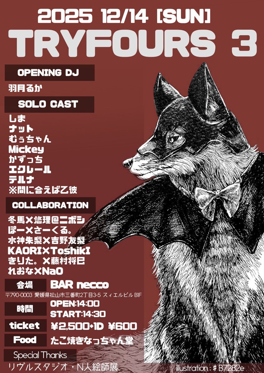 12/14(日)松山のBAR neccoにて開催の #TRYFOURS3 です🎊本日は「かずっち」をご紹介! 今回もアコギ引っ提げ、サポーターとして出演✨️彼の出番がきたときの体内アルコールボルテージは如何ほどか、それが問題です🥃ターン数が増える毎に威力が増…ちがうかも🫢出演順はくじ引き!引き当てろ極大値!