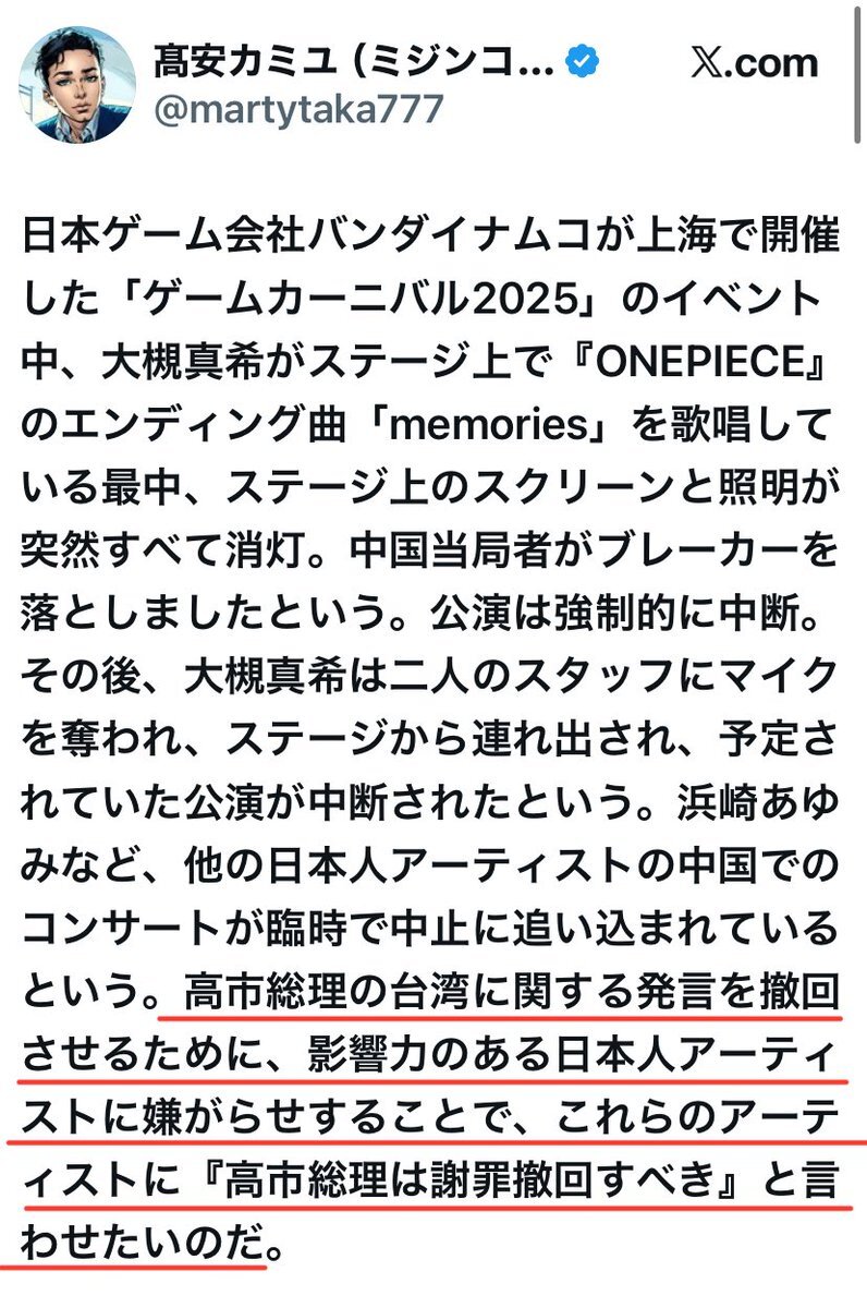 返信先:@shinjukuacc高市が失言したからだ。中国側は「発言を撤回すればよい」と言っている。だから撤回すればコンサートはできた。そうしたら何億?かは儲かっただろう。それが「国益」だというのが僕の考え方。 中国は独裁軍事国家だから、僕も「反中」だ。しかし、今それを批判しても現状では何も変わらないと思う。