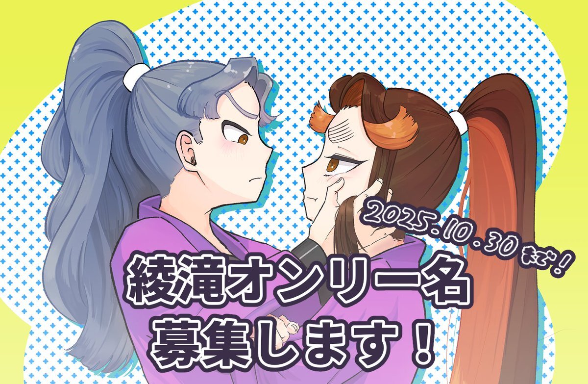 【綾滝オンリー名募集】 新刊カード目標枚数、皆様のおかげで無事達成しました!✨ オンリー名もあわせて投票できるとのことで、せっかくなら考えてみたいと思い、Googleフォームを作成しました。 ぜひお気軽にご参加ください🌹 ※私が考えた案も候補に入っています! 🔗forms.gle/u6uVuCTUZWZRHL… pic.x.com/N7GrI5Z5Cf