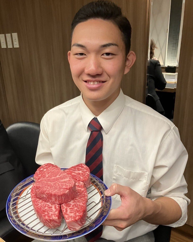 契約会見後、お肉を食べる #石垣元気 投手。 これからよろしくお願いします! #chibalotte #広報