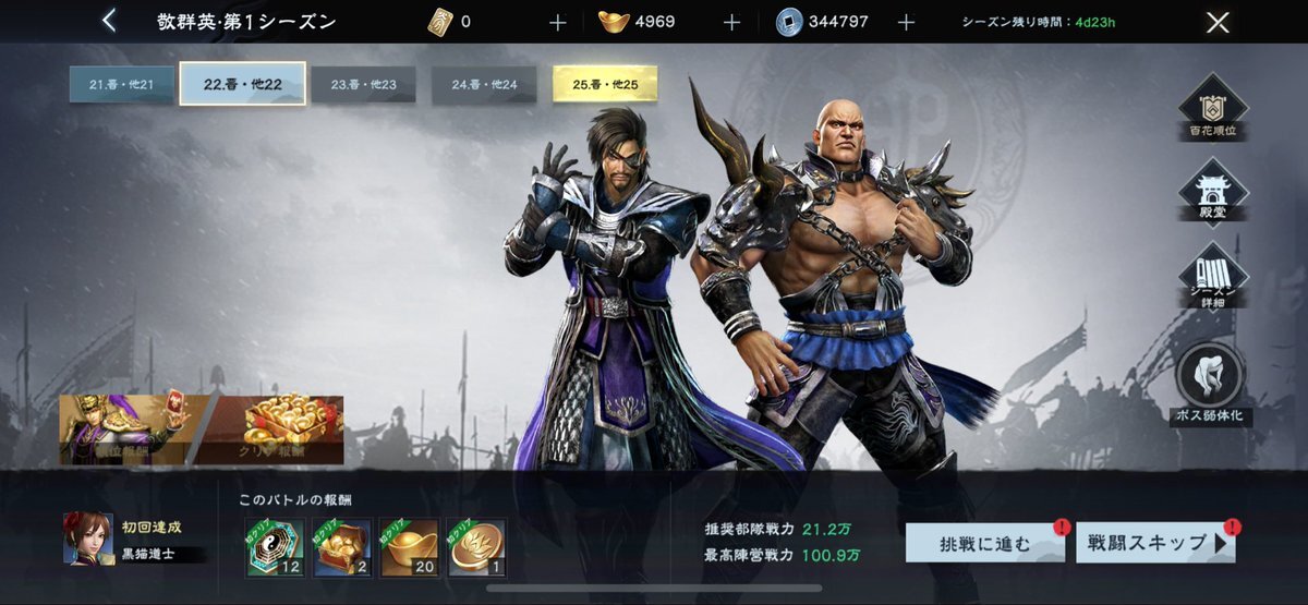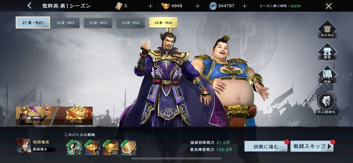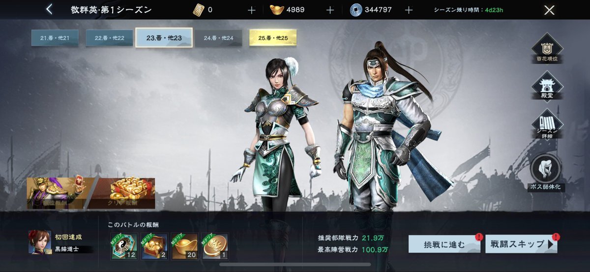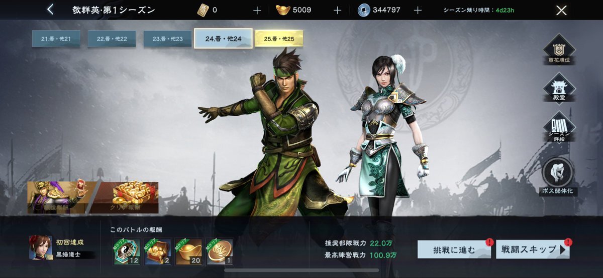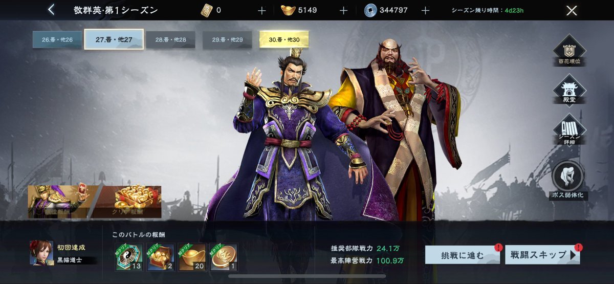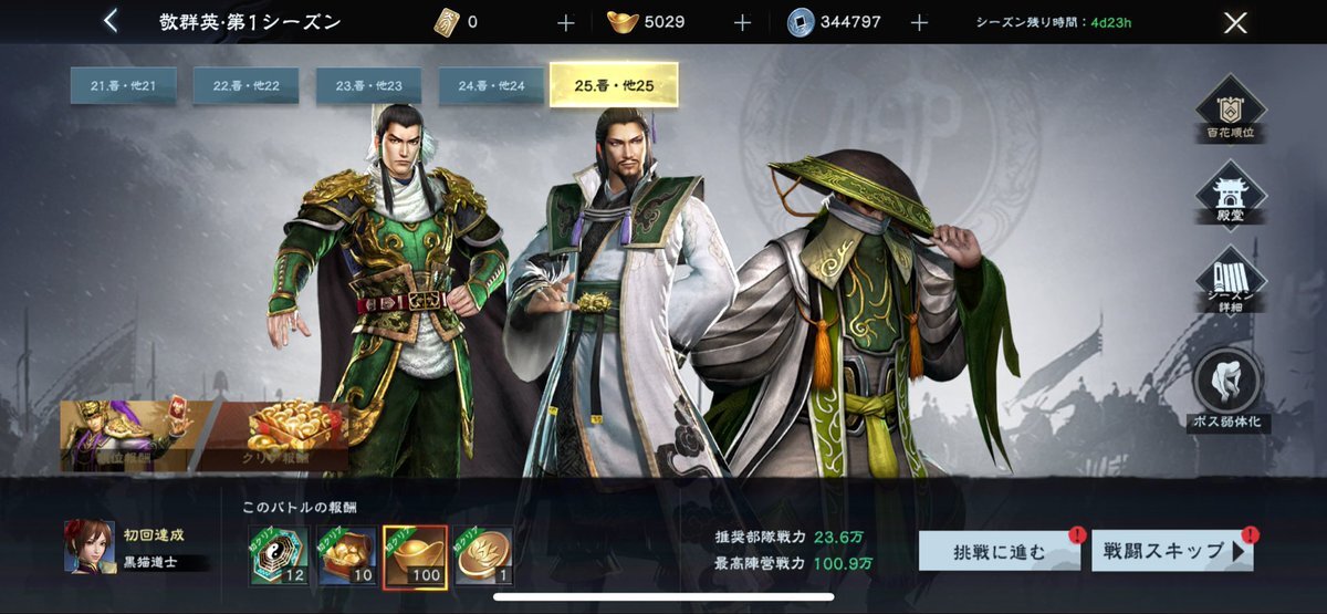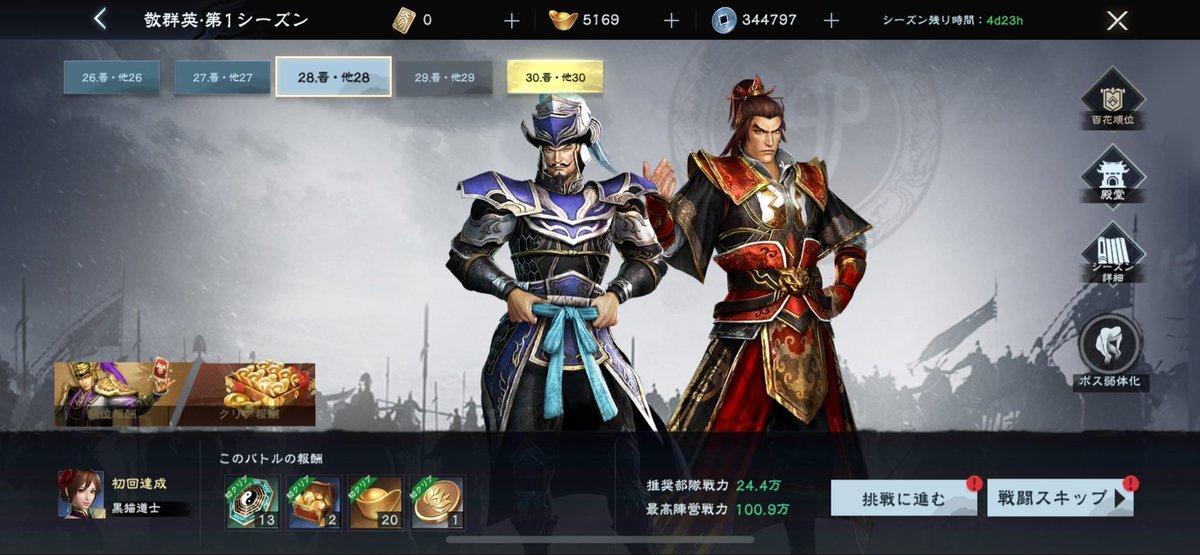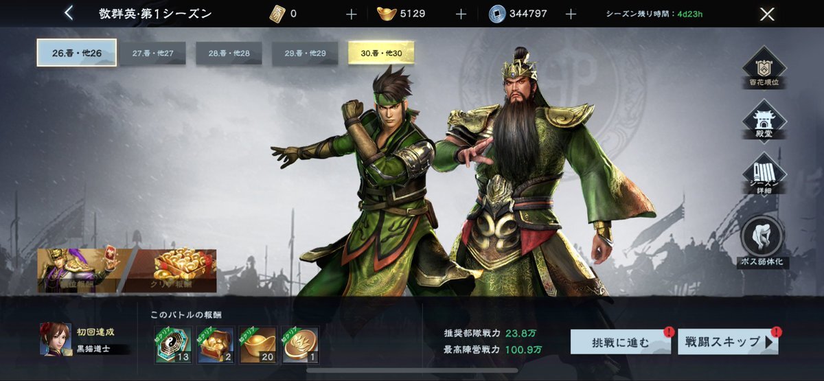 真・三國無双 覇 【百花】百花(晋・他) ・百花25:劉備,諸葛亮,龐統, ・百花26:関平,関羽, ・百花27:曹操,張角, ・百花28:張遼,孫権。 (スキップ。) pic.x.com/DEpmllaGId