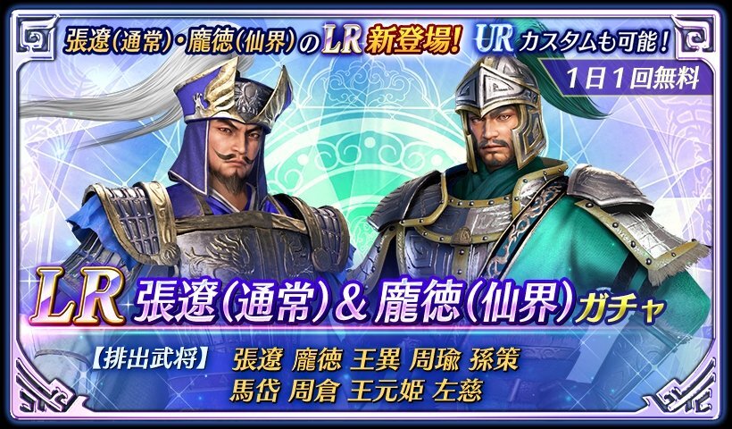 【鈴木P】アプリ『真・三國無双』 LR張遼(通常)・龐徳(仙界)が本シーズンより新登場! ガチャPt特典としても獲得できます! 排出対象のUR将星は 張遼、龐徳、王異、周瑜、孫策、 馬岱、周倉、王元姫、左慈 から3人選択可能 1日1回無料! 10/21(火) 9:59まで #さんむそアプリ #三無双 pic.x.com/XWn5GOdwwF