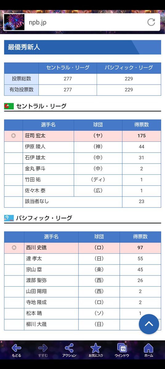 新人王自体は石川歩以来、野手の新人王が小坂誠以来と聞いて遠い目をしている まあ来年は毛利が13勝して2年連続になるから良いか〜