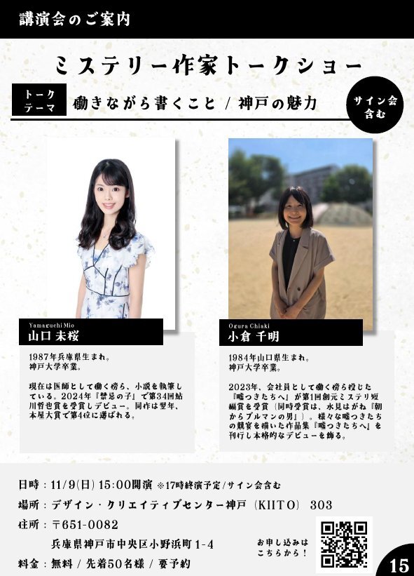 / お知らせ📢 \ 神戸の街を舞台にした謎解き企画とあわせて、 11月9日(日)には、神戸ゆかりのミステリー作家によるトークイベントを開催! 👩‍⚕️出演 山口未桜さん × 小倉千明さん “働きながら書くこと”と“神戸の魅力”を語ります。 ▼詳細・申込はこちらのリンクから👀 t.livepocket.jp/e/8gybk pic.x.com/SNPUHw2BtH