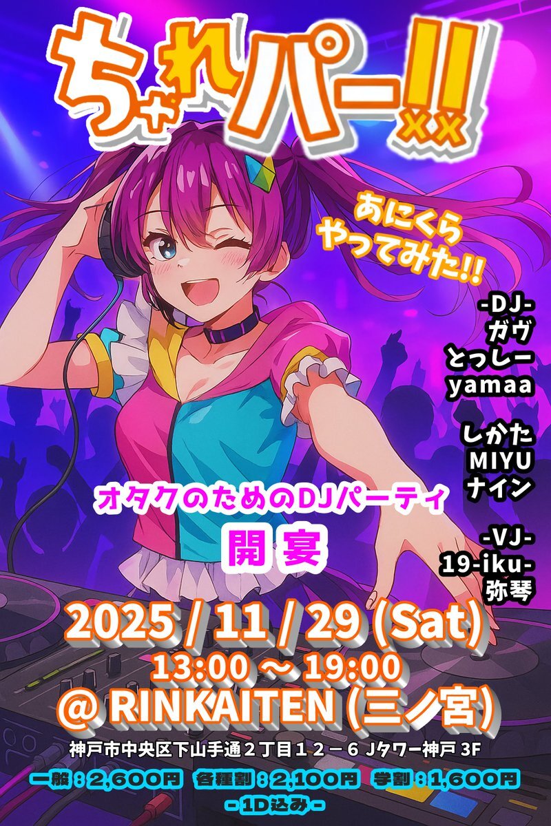 本日はこちら #ちゃれぱ 🗓️2025.11/29(土) ⏰13:00〜19:00 🪩RINKAITEN(兵庫県神戸市中央区) RINKAITENで待ってるわ〜! pic.x.com/Ub8fzqFRD2 x.com/djgav_cos/stat…