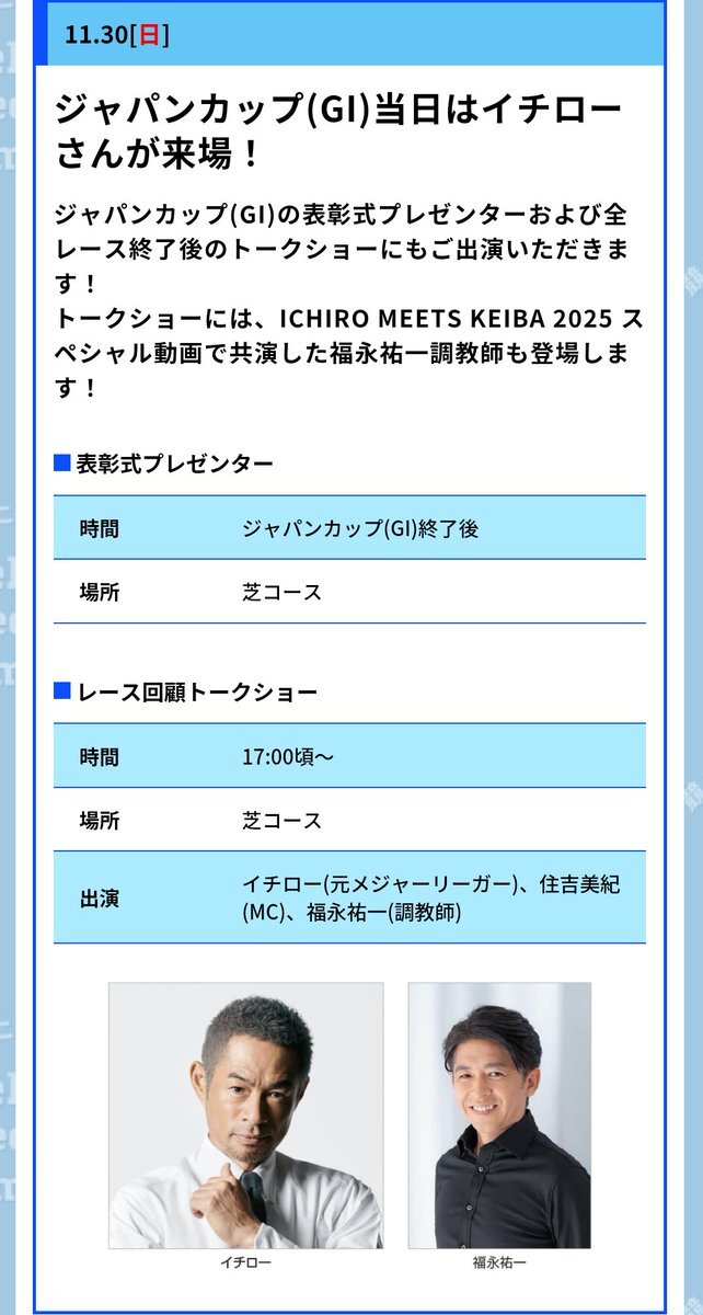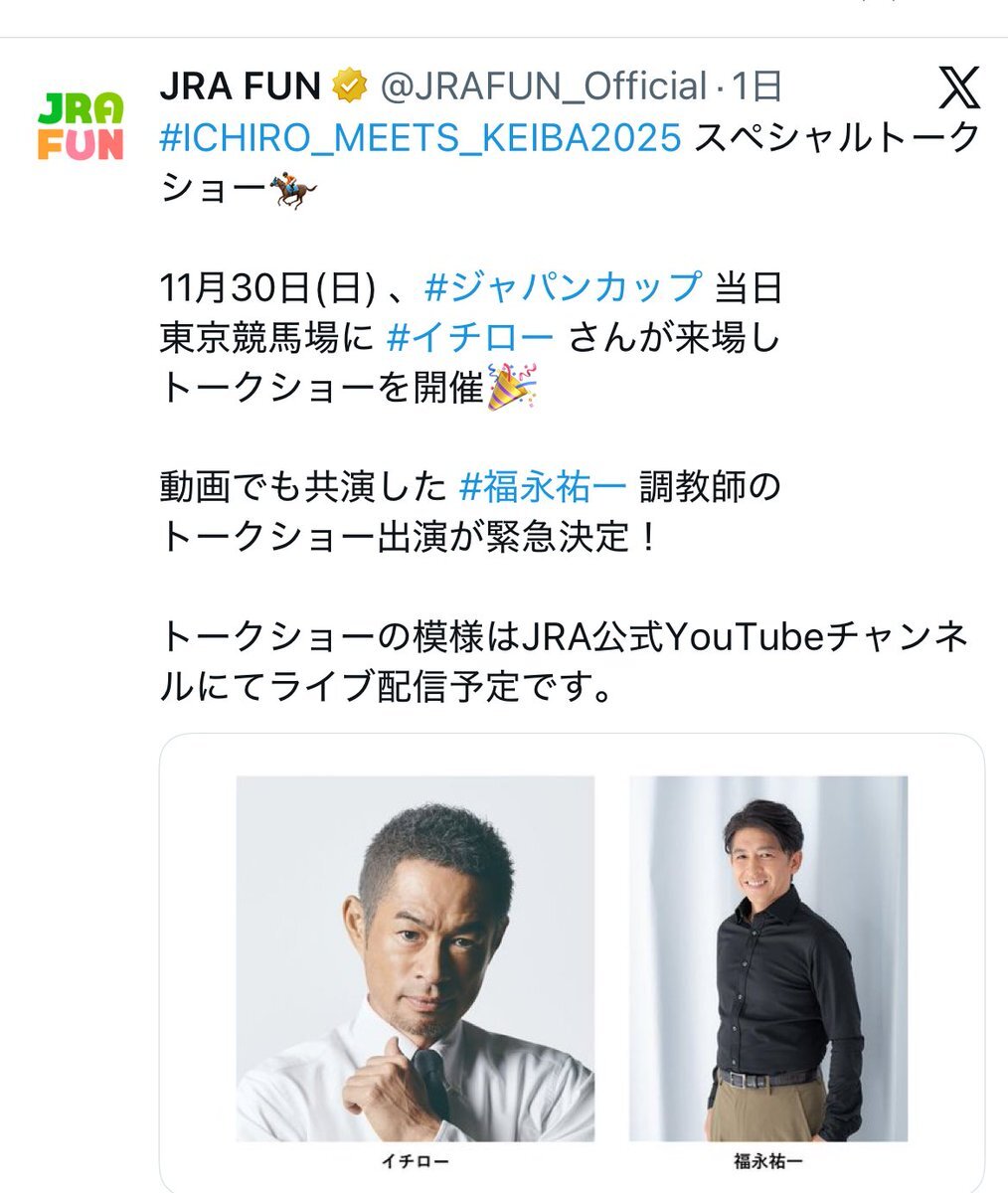 #ICHIRO_MEETS_KEIBA2025 スペシャルトークショー🏇 11月30日(日) 、#ジャパンカップ 当日 東京競馬場に #イチロー さんが来場し トークショーを開催🎉 動画でも共演した #福永祐一 調教師の トークショー出演が緊急決定! トークショーの模様はJRA公式YouTubeチャンネルにてライブ配信予定です。