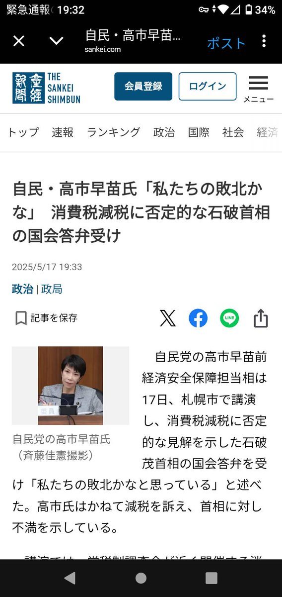 高市氏は食料品を対象とする軽減税率をゼロ%に引き下げるべきだと言ってたのにな。自民党内で色々言われて撃沈。。。 自民党ではやりたい事は無理。 敗北じゃないの? 自民・高市早苗氏「私たちの敗北かな」 消費税減税に否定的な石破首相の国会答弁受け sankei.com/article/202505… @Sankei_newsから