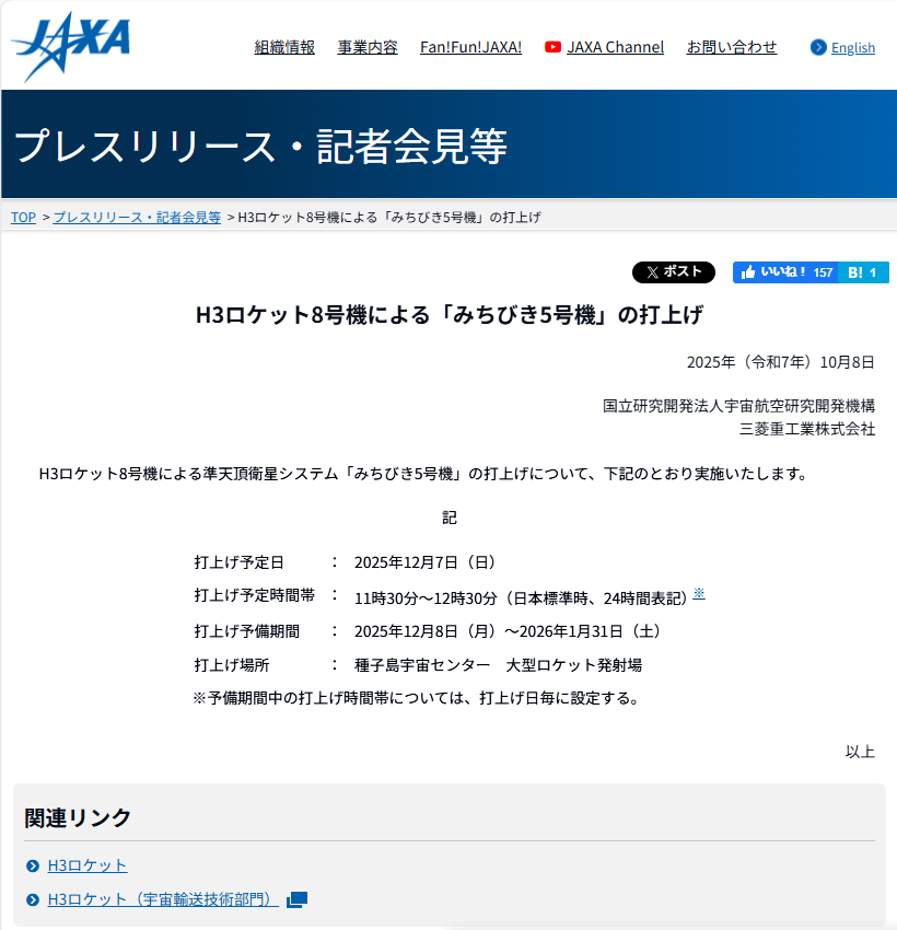 [プレスリリース] H3ロケット8号機による「みちびき5号機」の打上げ #JAXA jaxa.jp/press/2025/10/…