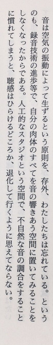 10月8日は、作曲家・武満徹の誕生日。 「音は空気の振動によって生ずるという原則を、存外、わたしたちは忘れている。というのも、録音技術の進歩等で、自分の肉体のすべてを音の響きあう空間に置いてみることをしなくなったからである。」(小沼純一編『武満徹エッセイ選』ちくま学芸文庫、P298) pic.x.com/1wh9jsAIVe