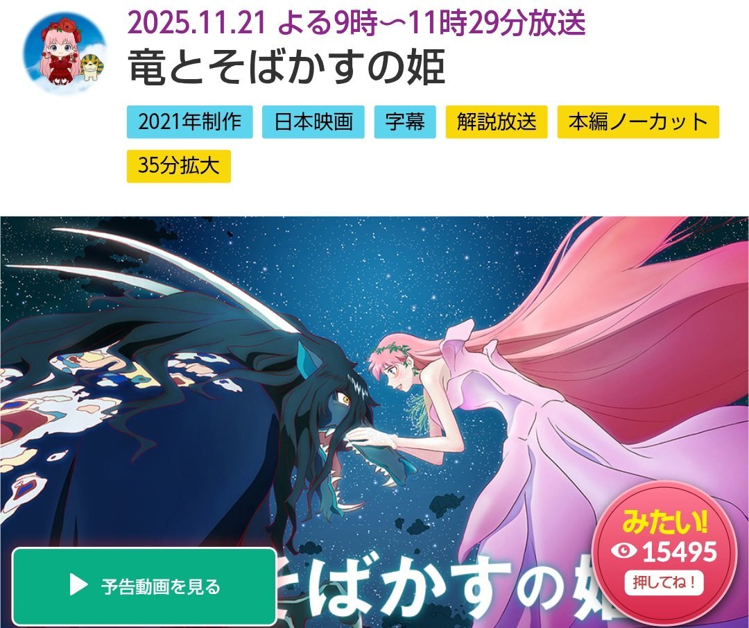 明日見ることにしたし。 竜とそばかすの姫という映画の前哨として。 x.com/torimechappy/s…
