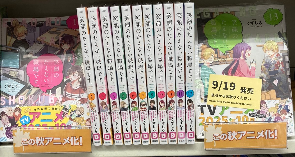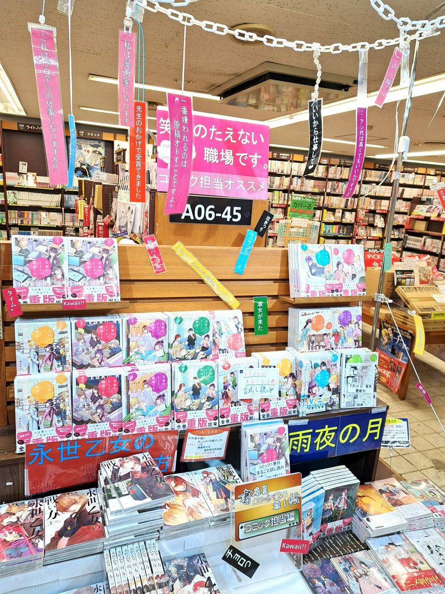 #笑顔のたえない職場です。 先週から売り場の台詞POPを 毎週すべて入れ替えています 今週は アシスタントのふたり はーさん(妹) と ねこのてさん の台詞です 隙間時間でサックリ読めるお仕事コメディコミックス アニメ第8話は今夜放送です。 #くずしろ #講談社 #えがたえ pic.x.com/51xzyRp0wB