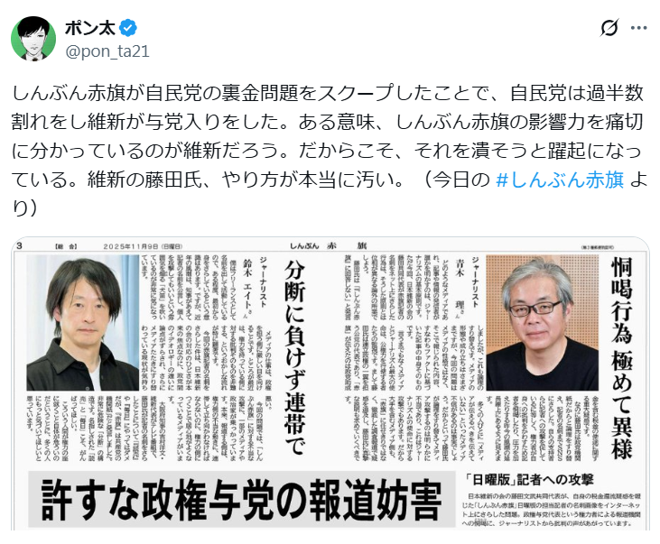 「しんぶん赤旗」の影響力はSNSより小さい。 第27回参議院議員通常選挙(7月20日)の比例代表選出議員選挙の最終結果 政党名 得票総数 得票率 日本保守党 2,982,093 5.04% 日本共産党 2,864,739 4.84% 日本共産党が支持を減らしているのは明らか。 pic.x.com/hQhLMzB7I1
