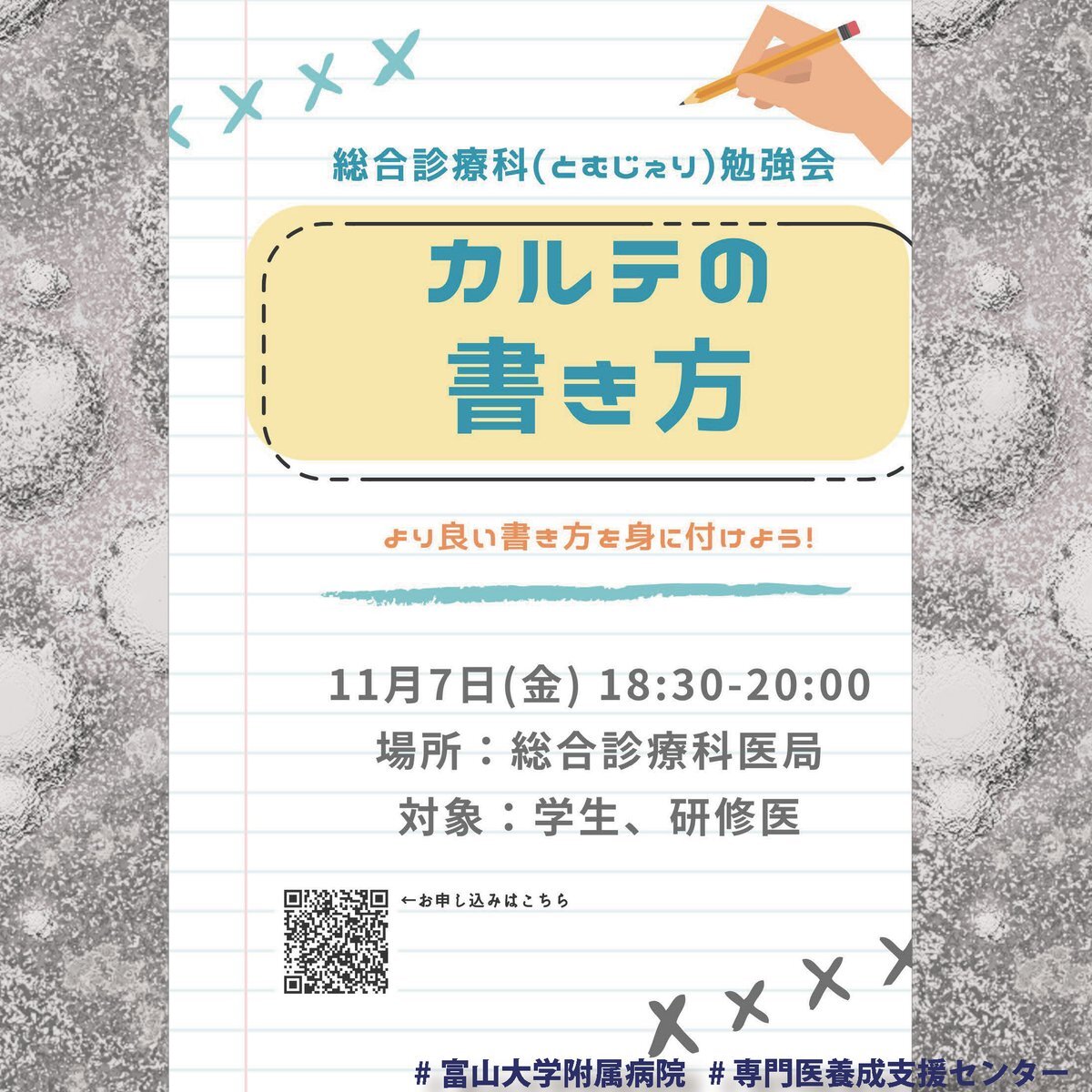 #総合診療専門医 プログラム #総合診療科 カルテの書き方 について 総合診療科(#とむじぇり) 勉強会が11月7日(金) 18:30~20:00 場所:総合診療科医局 対象:学生・研修医 に開催されます。 是非お申込みください。 pic.x.com/9xEYBwqtu1