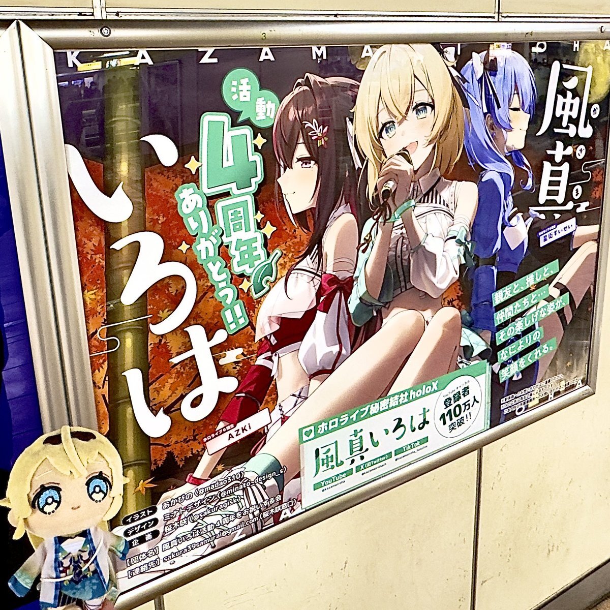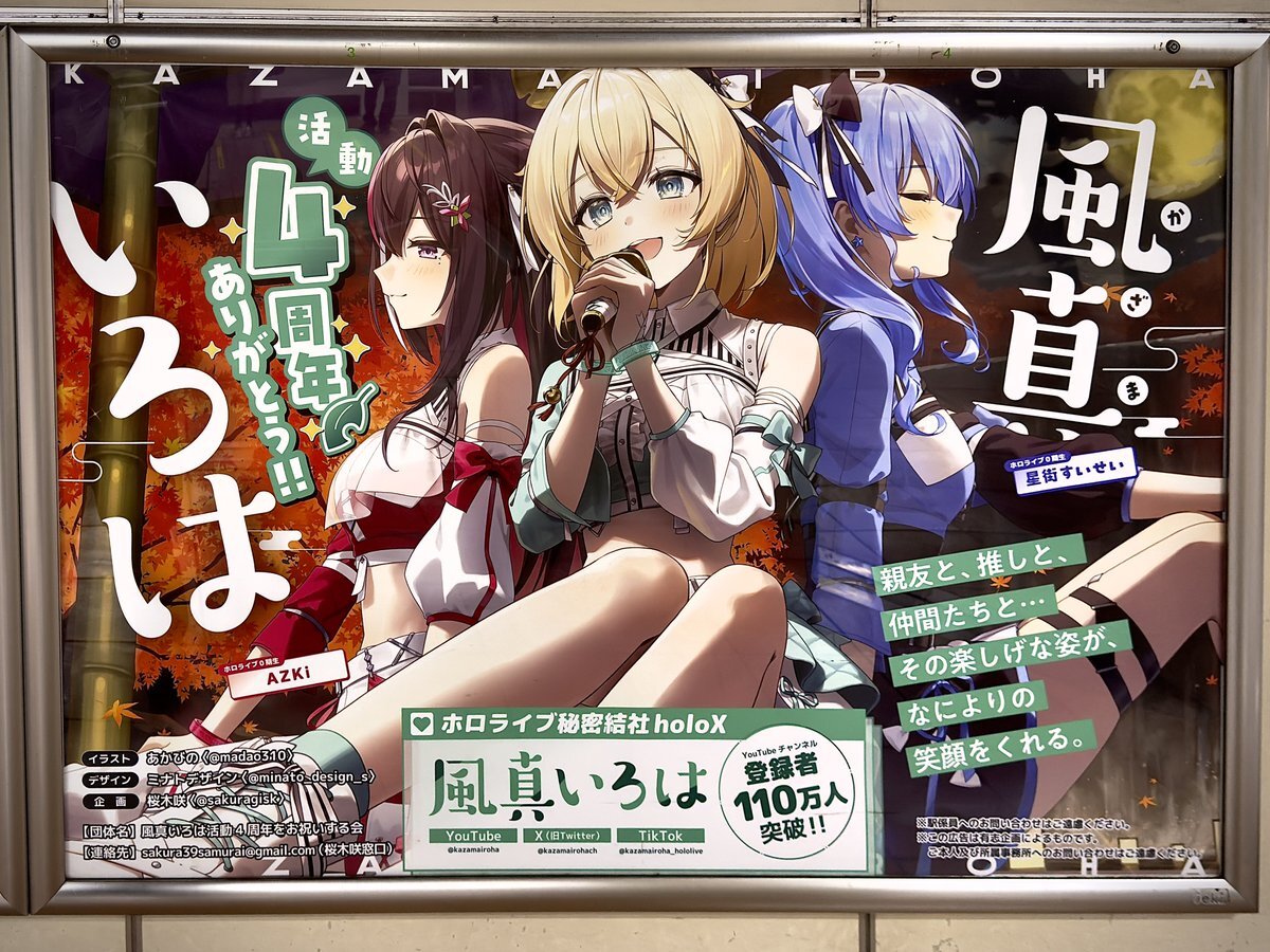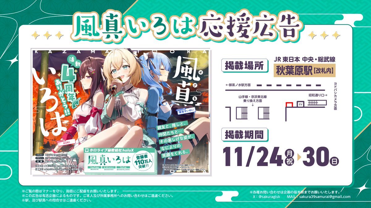 🍃応援広告のお知らせ🍃 風真いろはさん活動4周年を祝し、秋葉原駅に応援広告を掲示✨️親友のAZKiさんと推しの星街すいせいさんも一緒にお願いしました⚒☄️楽しい活動になるよう応援してます🎉 イラスト:あかびのさん@madao310 デザイン:ミナトデザインさん@minato_design_s 企画:私 #holocheer