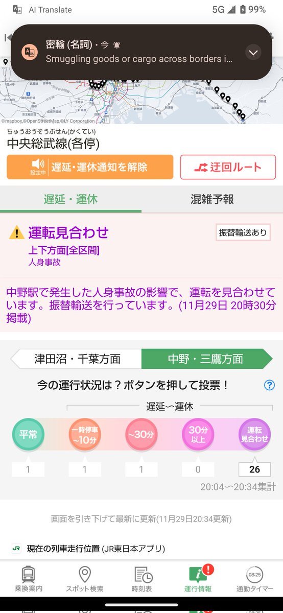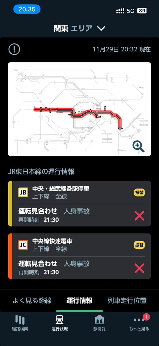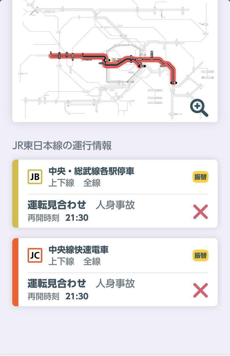 電車運行情報🚃 中央線快速電車及び中央・総武線各駅停車は、中野駅で発生した人身事故の影響を受けて、運転見合わせ中とのことです(JR東日本運行情報ページから)。 (11/29.20時40分現在の情報) 見合わせ区間等最新の運行情報についてはJR東日本のページでご確認ください。 x.com/jre_f_chuo/sta…
