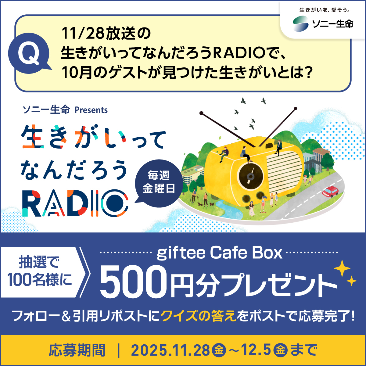 「giftee Cafe Box 500円分」をプレゼント🎁 Q. 11/28放送の生きがいってなんだろうRADIOで、 こっちのけんとさんが見つけた生きがいとは? ▼応募方法 ①本アカウントをフォロー ②この投稿の引用RPに答えを投稿 🔷当選者のみ後日DM 🔷12/5(金)23:59まで 👇聞き逃した方はツリー投稿をチェック! pic.x.com/dGuVapdLb3