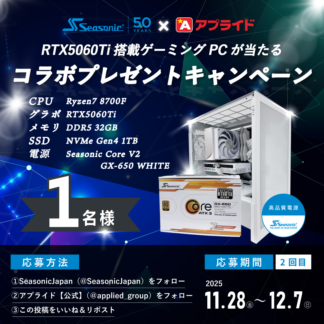 / Seasonic×アプライドコラボ企画 まっしろなゲーミングPCが当たる プレゼント企画実施中!!!!! \ ★応募方法★ 1)2社のアカウントをフォロー 2)本投稿をいいね&リポスト 3)#ゲームであったショックだったこと をつけて引用リポストで当選確率UP
