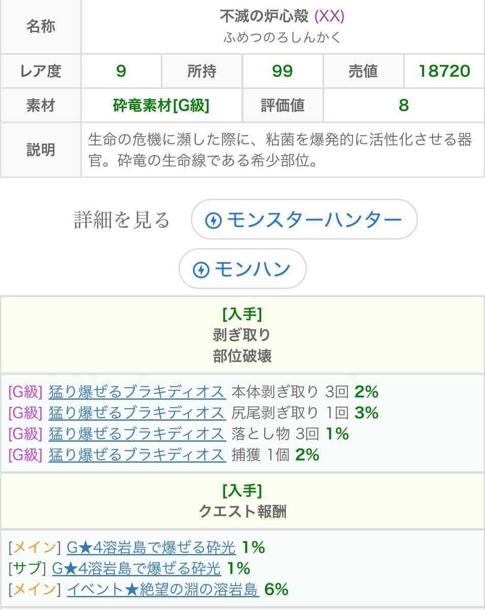 臨界ブラキの素材何回やっても揃わないからサイトで調べたら不滅の炉心殻のドロ率低すぎてキレそう まだ全然初心者だから1周30分以上かかるもんで1日に何回も回る気力ないっすよ pic.x.com/yfITBFFE2d