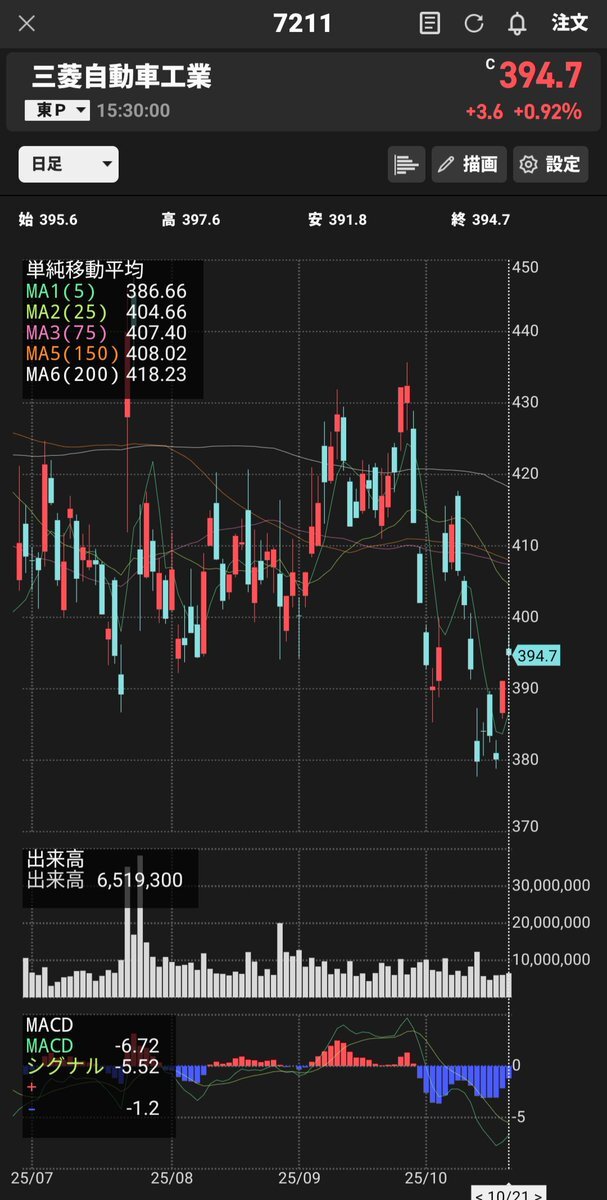 ピピピピピッ!!!! kabukinレーダーが大きく反応したので購入しました☆彡 ◎三菱自動車工業 7211 ◎反応理由 ・200日線下でウロウロしてて割安 ・デリカミニの人気 ・高市首相の自動車関税対策 中長期かな〜💦 買ってから少し下がったので凹んでます😓 pic.x.com/nPKlFQuObv