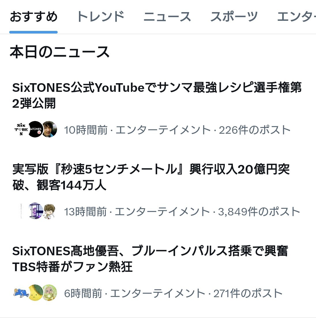 本日のニュース📢🎶 SixTONES✕YouTube🐟️ 秒速5センチメートル✕興行収入20億突破🚀 こーち君✕ブルーインパルス搭乗🛫 毎日ニュースも幸せにしてくれる🎶🌸 SixTONES最高🙌 チムスト大好き🌸 #ニュース #SixTONES #チムスト pic.x.com/nq06mbkTdb