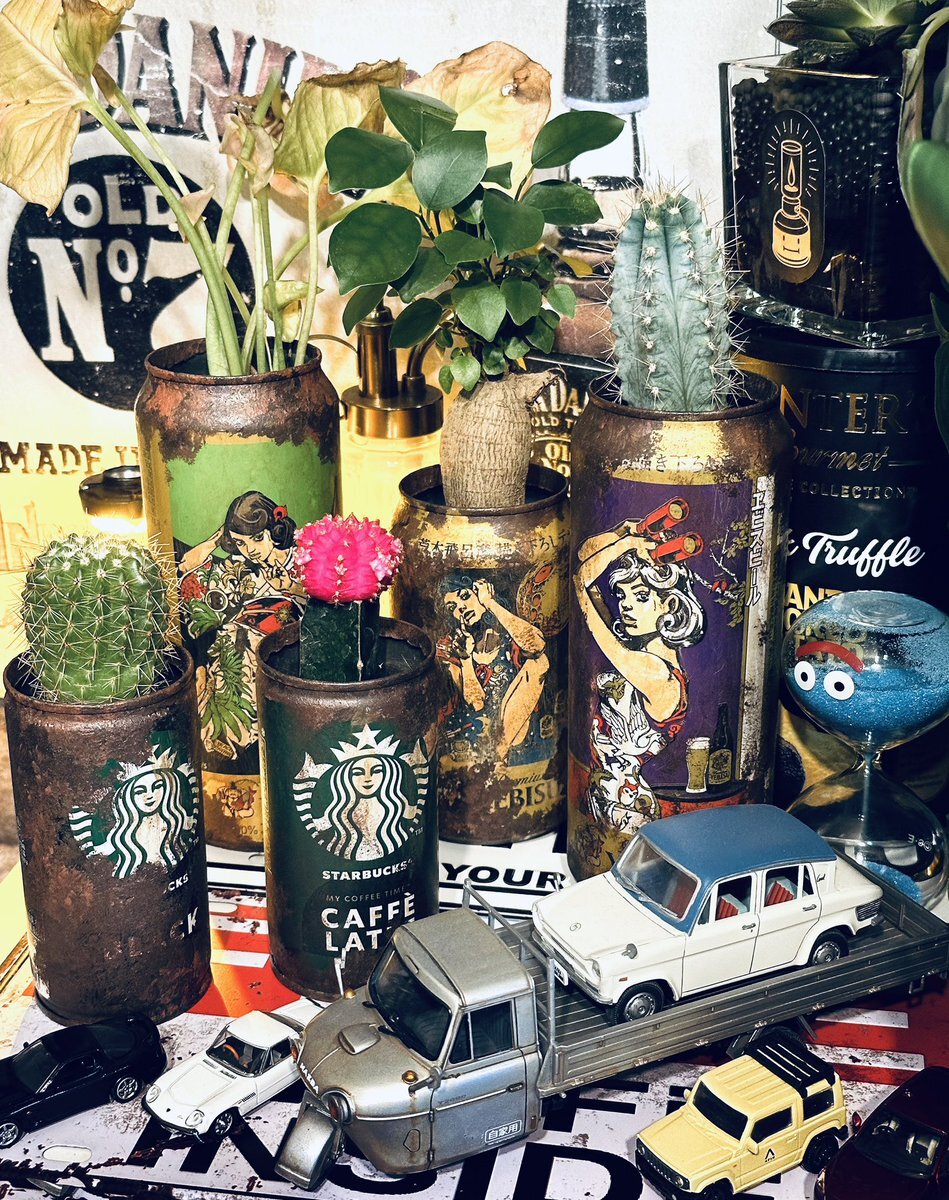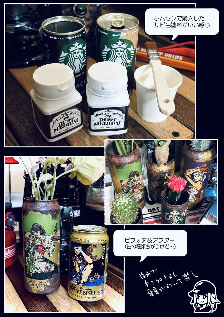 【わびサビ】 荒木飛呂彦先生画のビール缶が素敵なので サビ&汚し加工をして仕事場の植物用に 植え替えしましたわ🌱 マツダのトラックも数年前に作った物 ウイスキー瓶とはまた違った趣きで 仕事場の癒しコーナーになってるのよね pic.x.com/ABv2Up5uw2 x.com/himiko358/stat…