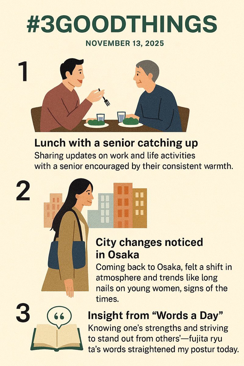 2025/11/13の #3goodthings ⸻ 1先輩とランチで近況共有。温かさに励まされた。 ⸻ 2大阪勤務で街の変化を実感。長いネイルが印象的。 ⸻ 3藤井隆太氏の言葉「自分の強みを知り、差をつける努力を」に気づき。意識を正す。 pic.x.com/l2eeN6Xy9I