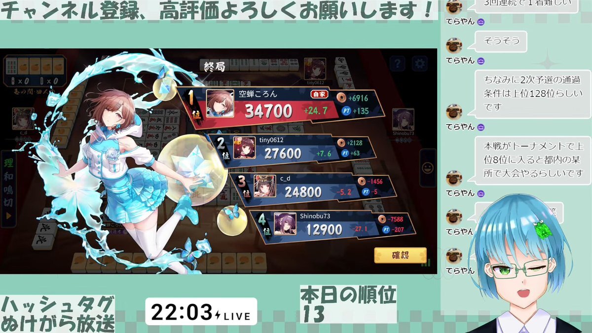 雀魂四麻半荘玉の間段位戦見てくださった方、ありがとうございました!!!本日の順位は、1312ということで、ポイント結構盛れました!円香に変えて勝ちまくってる気がするけど、もしかしてノクチルの中でも小糸は最弱???いや、小糸も頑張ろうな! 今後も麻雀の配信は定期的にしますのでよろしく! pic.x.com/T4v1b0qdrK