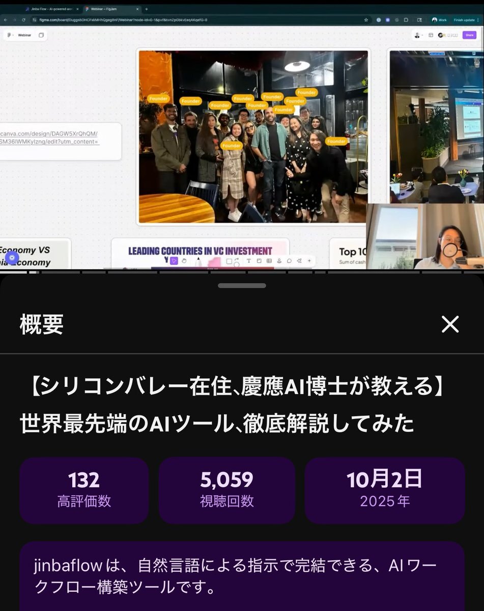🎓 慶應の機械学習博士号を持ち、 革新的なAIワークフローツール「jinba」を開発するCarnot inc. 代表の松森が、 シリコンバレー最先端のAIツールを解説しました 1. AI・AIツールの進化を先取り 2. 世界的な起業家が集うサンフランシスコでの生活 3.