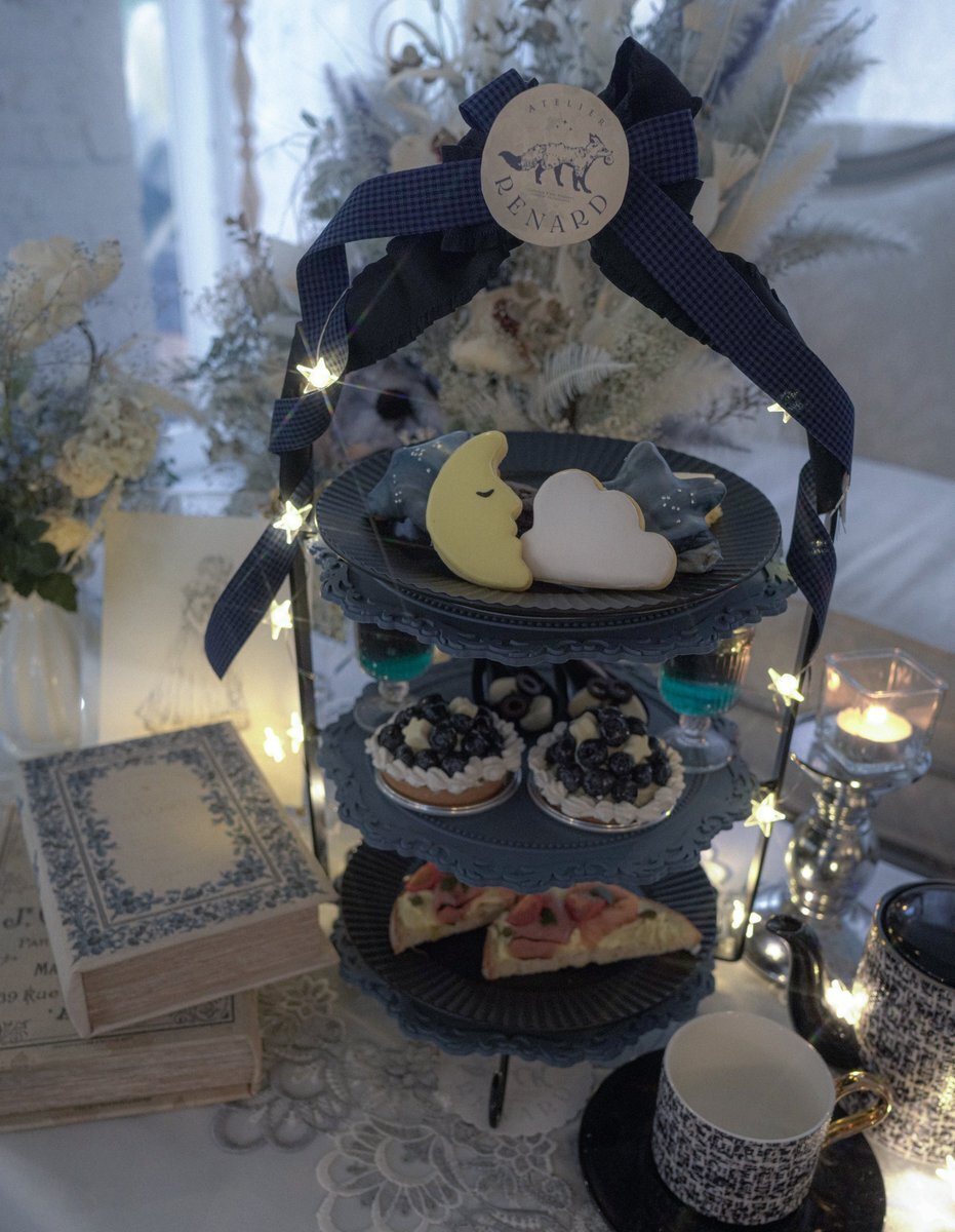 ⋆ 。゜☁︎ 。⋆ 。゜☾゜。⋆ 🌃Starlight afternoon tea -静かな夜に、月と星と秘密のレシピ。- 小さな星がきらめく台座に、月と雲のアイシングクッキー、星屑のドーナツ、夜空のゼリー。 眠れない夜、星のお皿に物語を並べて。