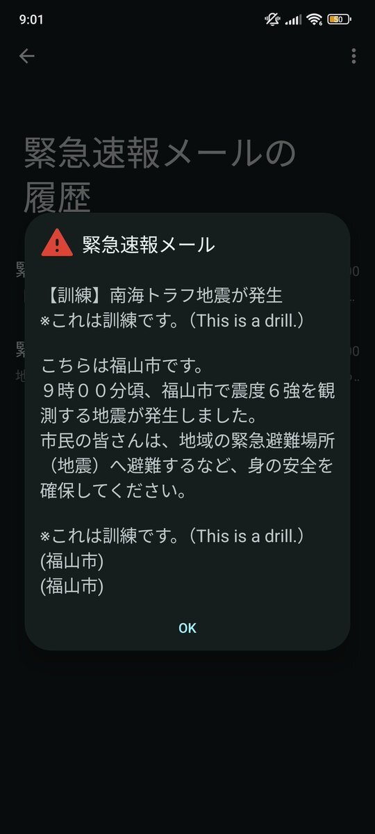 緊急速報メールが来てめっちゃ焦った💦 訓練メールでした。