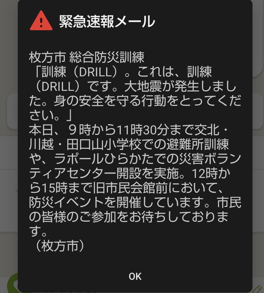 返信先:@jOVghhX82vvJdGyいや(ヾノ・∀・` )チャウチャウ 今日のは枚方市だけの防災訓練メール✉️😅