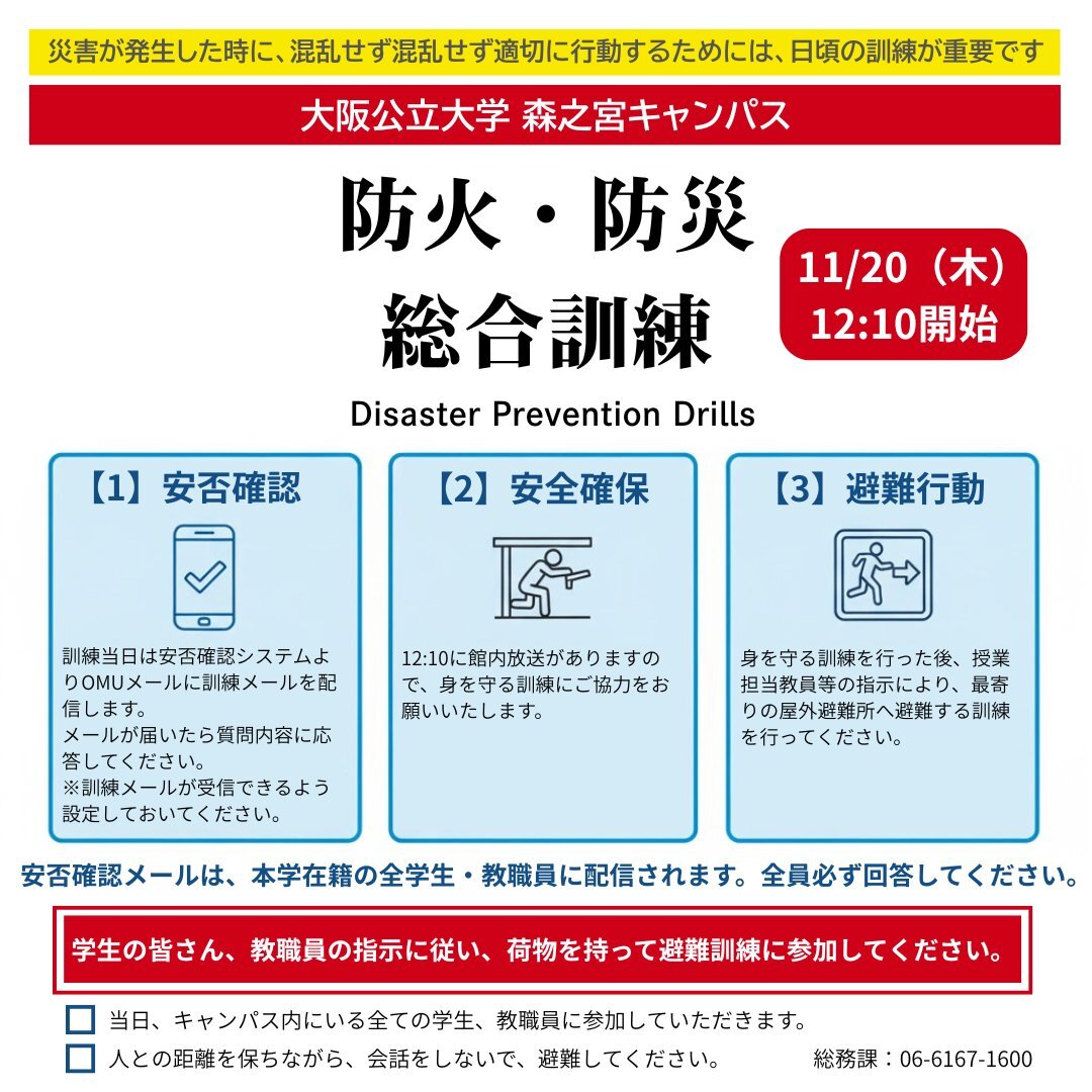 明日11/20(木)12:10より「2025年度 森之宮キャンパス防火・防災総合訓練」を実施します。 対象は森之宮キャンパスの全学生・教職員です。教職員の指示に従い避難訓練に参加してください。 安否確認システム(ANPiS)から訓練メールが全学生・教職員へ順次配信されますので、必ず回答してください。 pic.x.com/qPHwM4ijhz