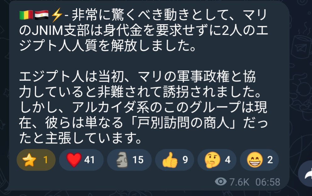 西アフリカ・マリで勢力を拡大するアルカイダJnimは拘束していたエジプト人2人を身代金なしで解放しました 当初マリのゴイタ軍事政権に協力していたとしていましたが、その後ただの訪問販売の商人だったことがわかったからとのことです pic.x.com/UKoFbbr8y7