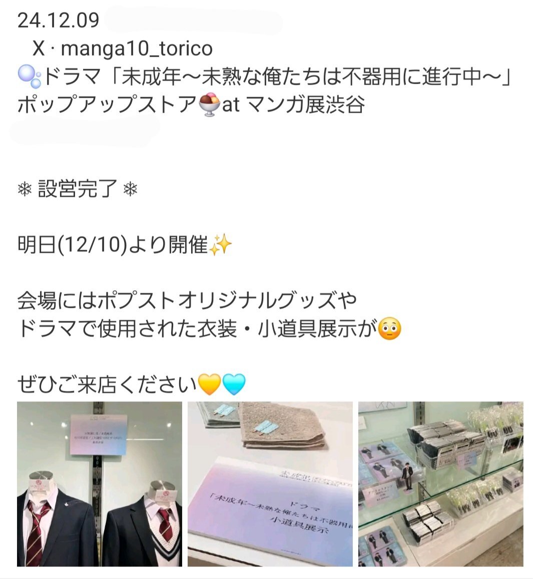 +12月9日🍨 #未成年箱推し ポップアップストア設営完了のお知らせ✨ マンガ展渋谷に行かれた方たくさんおられますかね🫧 制服やアイスハンカチ…直接見れて良かったですね💛🩵 cr manga10_toricoX pic.x.com/nVXRtBNdW4