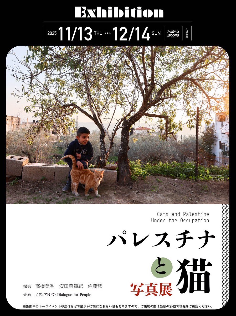 📢写真展開催のお知らせ📢 「パレスチナと猫」写真展 〜Cats and Palestine under the occupation〜🐈 🗓️11/13(木)〜12/14(日)まで 撮影:高橋美香、安田菜津紀、佐藤慧 @mikairvmest @NatsukiYasuda @KeiSatoJapan 企画:メディアNPO Dialogue for People 🔗 momobooks.jp/RmX8KLhJ/5PAq9…