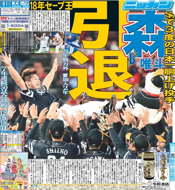 【20日付西部本社版1面】 DeNA #森唯斗 投手が現役引退を決断したことが19日、分かった。近日中に正式発表される。通算485試合に投げソフトバンク時代には3度の胴上げ投手、18年にセーブ王のタイトルも獲得。通算100ホールド100セーブなど、輝かしい成績を収めてきた右腕が現役生活にピリオドを打つ。