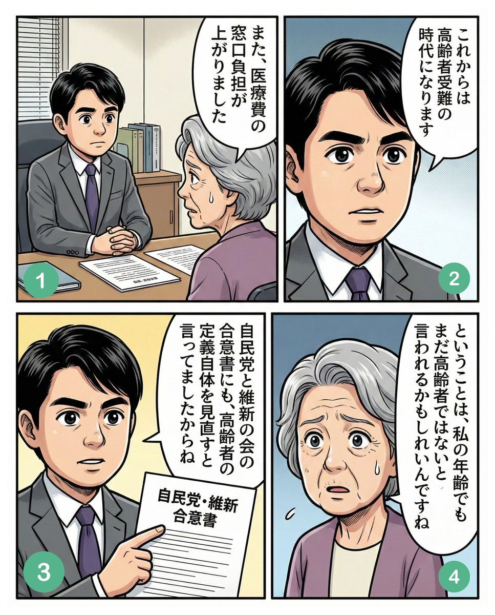 自民党と日本維新の会が連立政権樹立のために取り交わした連立政権合意書には、12の項目がありました。 その2番目が社会保障政策となっており、その小項目の5番目には「年齢に関わらず働き続けることが可能な社会を実現するための高齢者の定義見直し」との記載があります 。 pic.x.com/2TKp5oDAhn