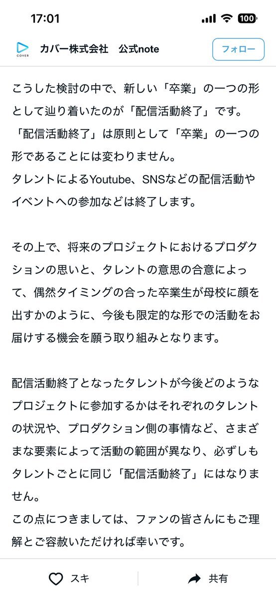 返信先:@nepunosukeホロメンが選んだからです 公式のnote見ましょう >とても大事なこととして、「卒業」と「配信活動終了」に優劣はない >どのような形をタレントが選択したとしてもそれは尊重されるべき決断