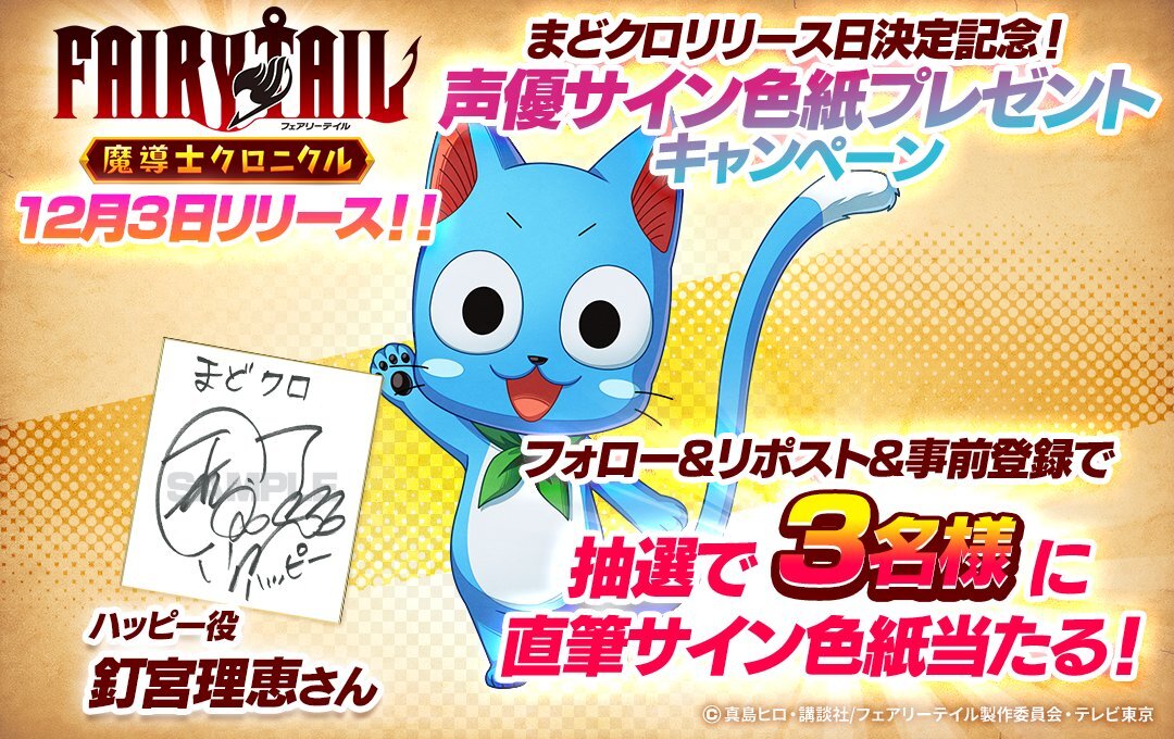⋰ 声優サイン色紙プレゼント🎁✨ ⋱ #ハッピー 役 #釘宮理恵 さんの直筆サイン色紙を 抽選で3名様にプレゼント🔥 ▼応募方法 ①@madochro_jpをフォロー ②この投稿をリポスト ③アプリストアで事前登録 ※11/28(金)23:59 まで ▼事前登録はこちら madochro.com #フェアリーテイル