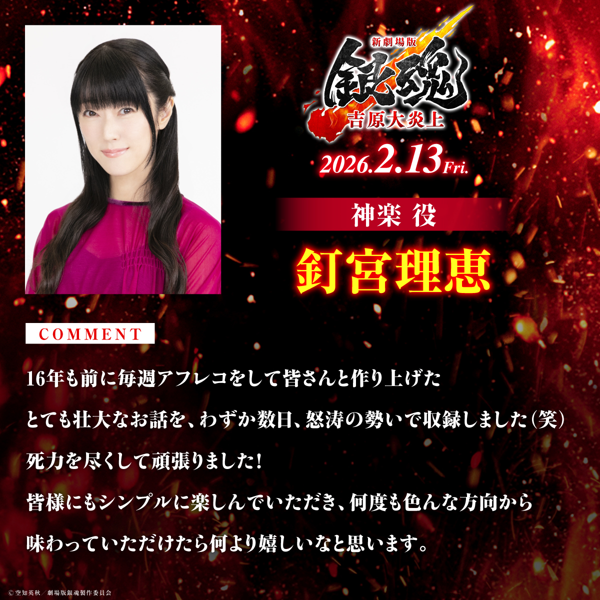 \\ 🔥キャストコメント到着だァァァ‼🔥 // アフレコを終えた 神楽役 #釘宮理恵 さんより コメントをいただきました! 🎬2026.2.13 公開『#新劇場版銀魂 -吉原大炎上-』 公式サイトはこちら👇 wwws.warnerbros.co.jp/shingintamamov… #新銀魂大炎上祭 #gintama