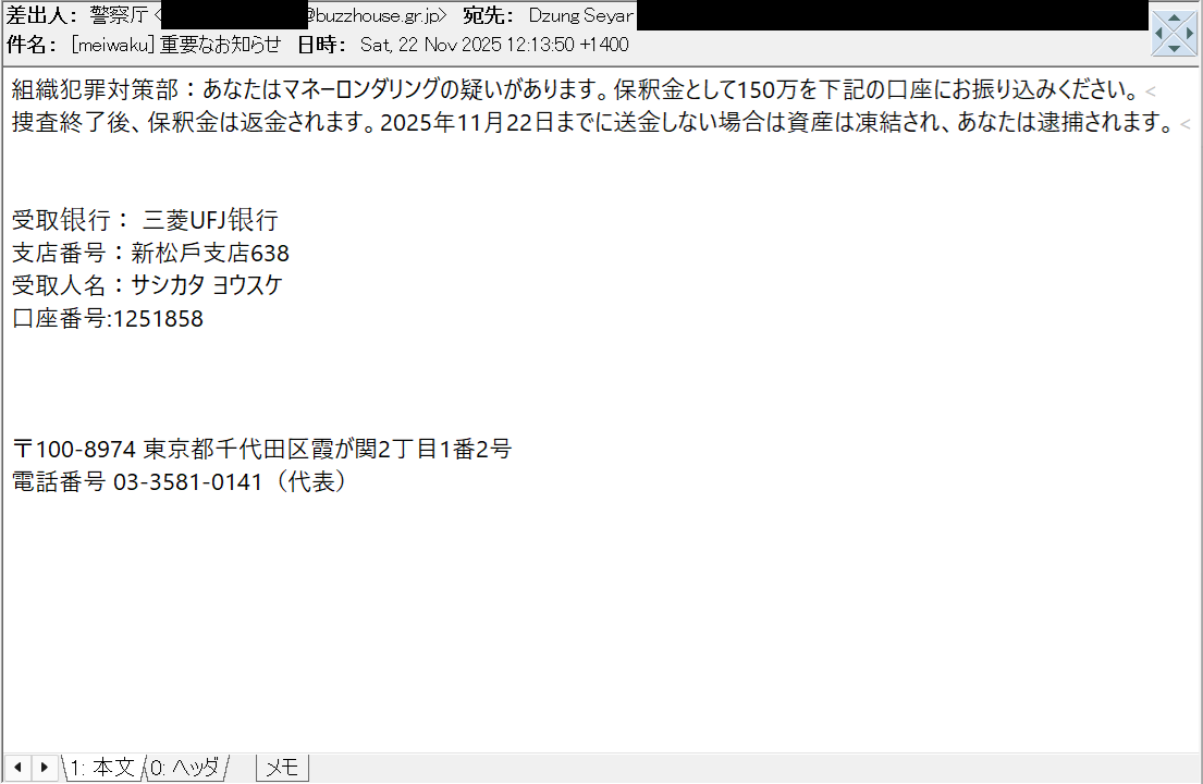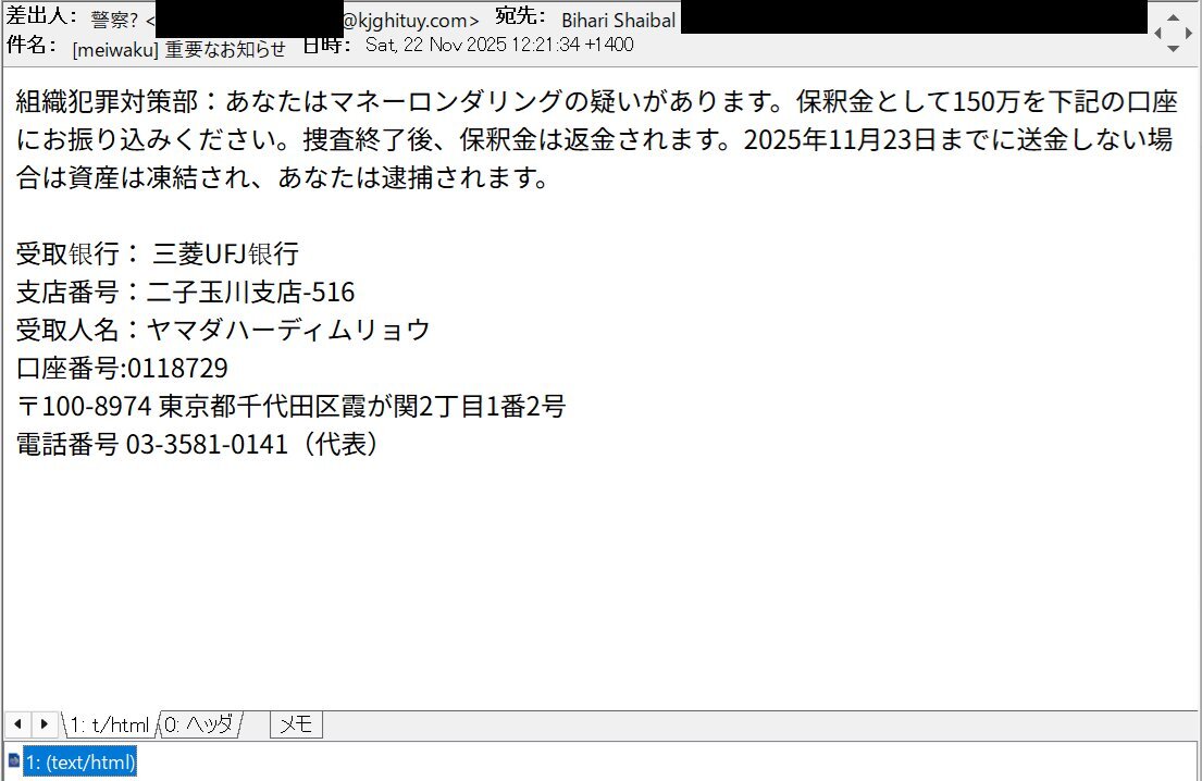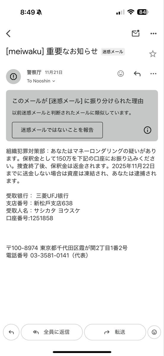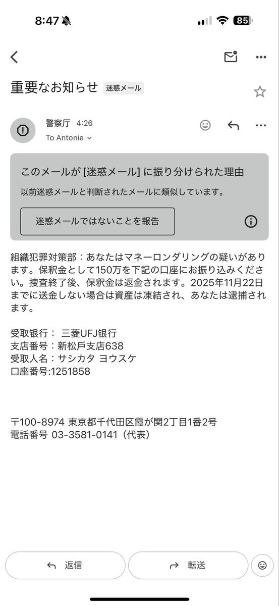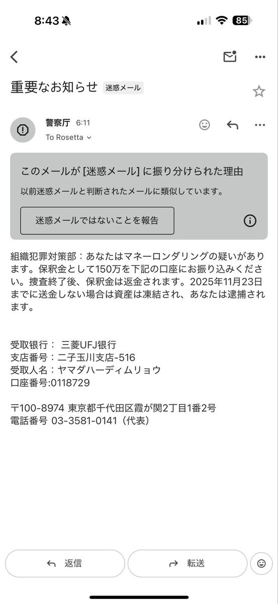 〝警視?〟ブームですか? バカ中国人によるフィッシングメールが🤪 この銀行口座から中国人詐欺グループを摘発しよう‼️ 警視庁さん! #詐欺情報 #中国人詐欺グループ pic.x.com/KrgEHnWpju