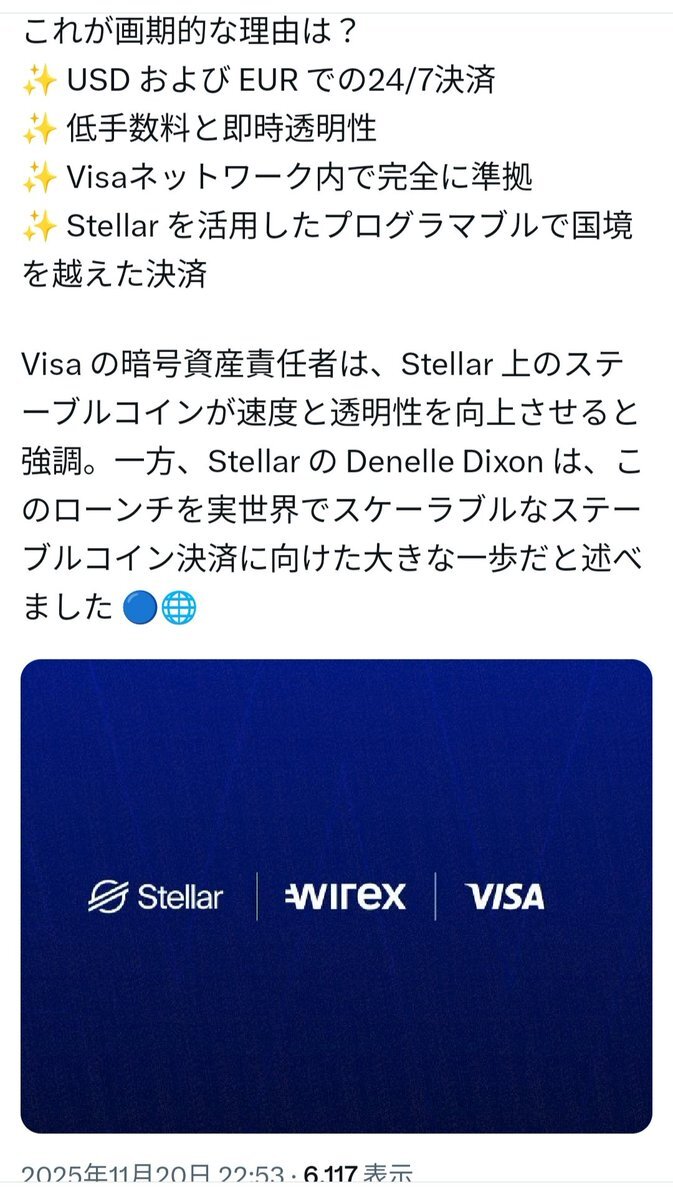こちらはVisa×Stellar デュアルステーブルコインVisa決済 カード決済はセルフカストディウォレットからリアルタイムで直接決済可能 従来の銀行レール不要 x.com/XLM_XRP_inside… 引き落としが銀行口座でなくセルフウォレットからのデビットカード? x.com/sunQ2024MEGA/s…