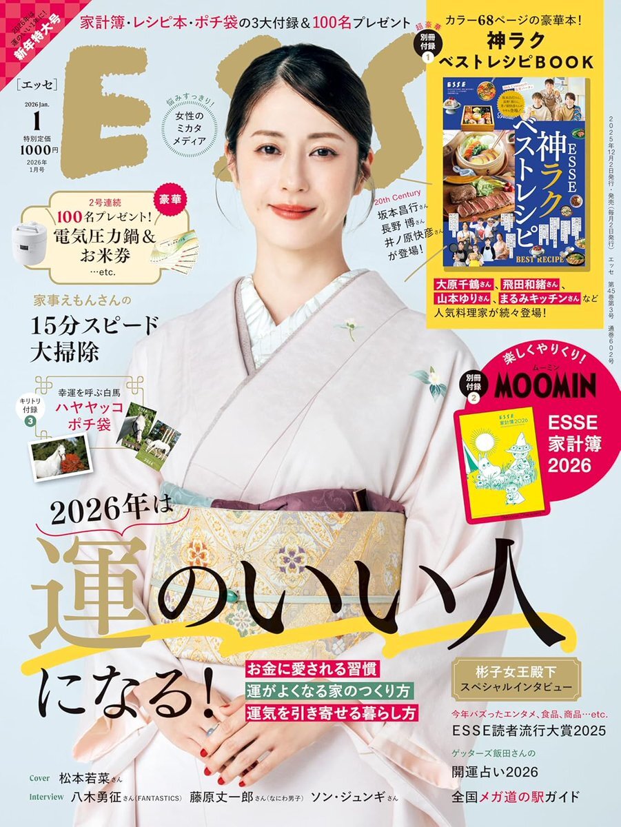 エッセ 2026年1月号 雑誌 – 2025/12/2 ESSE amzn.to/4rqCFID amazon #ad 表紙 松本若菜 付録 神ラク ベスト レシピBOOK 坂本昌行 長野博 井ノ原快彦 他 ハヤヤッコ ポチ袋 ムーミン家計簿 松平健 中園ミホ 八木勇征 家事えもん ゲッターズ飯田 藤原丈一郎 七五三掛龍也 pic.x.com/LR0cxlE7de