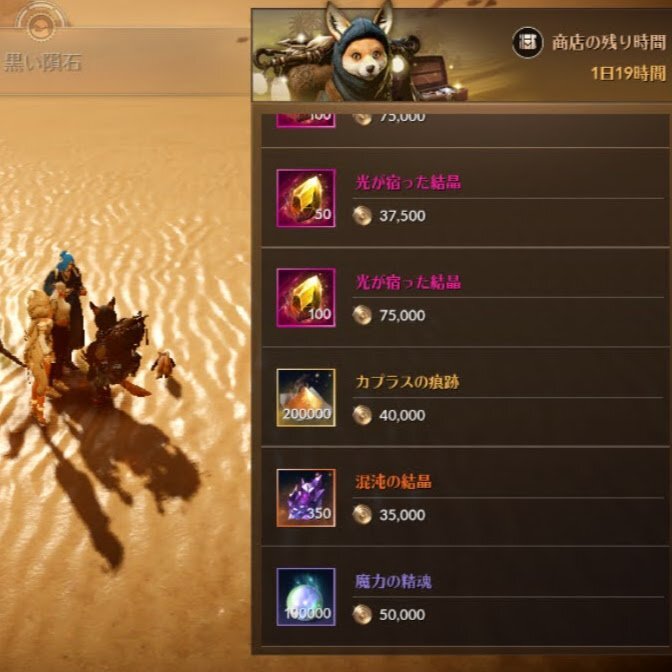 今週の大砂漠のモルコ 場所も売り物も既視感あるモルコ モルコ「アクラド?なにそれ?」 ※営業時間は残り1日と16時間 🚩黒い隕石でリストに出ます。 #黒い砂漠モバイル pic.x.com/8IOaqU1fWE x.com/HachiemonThe3r…